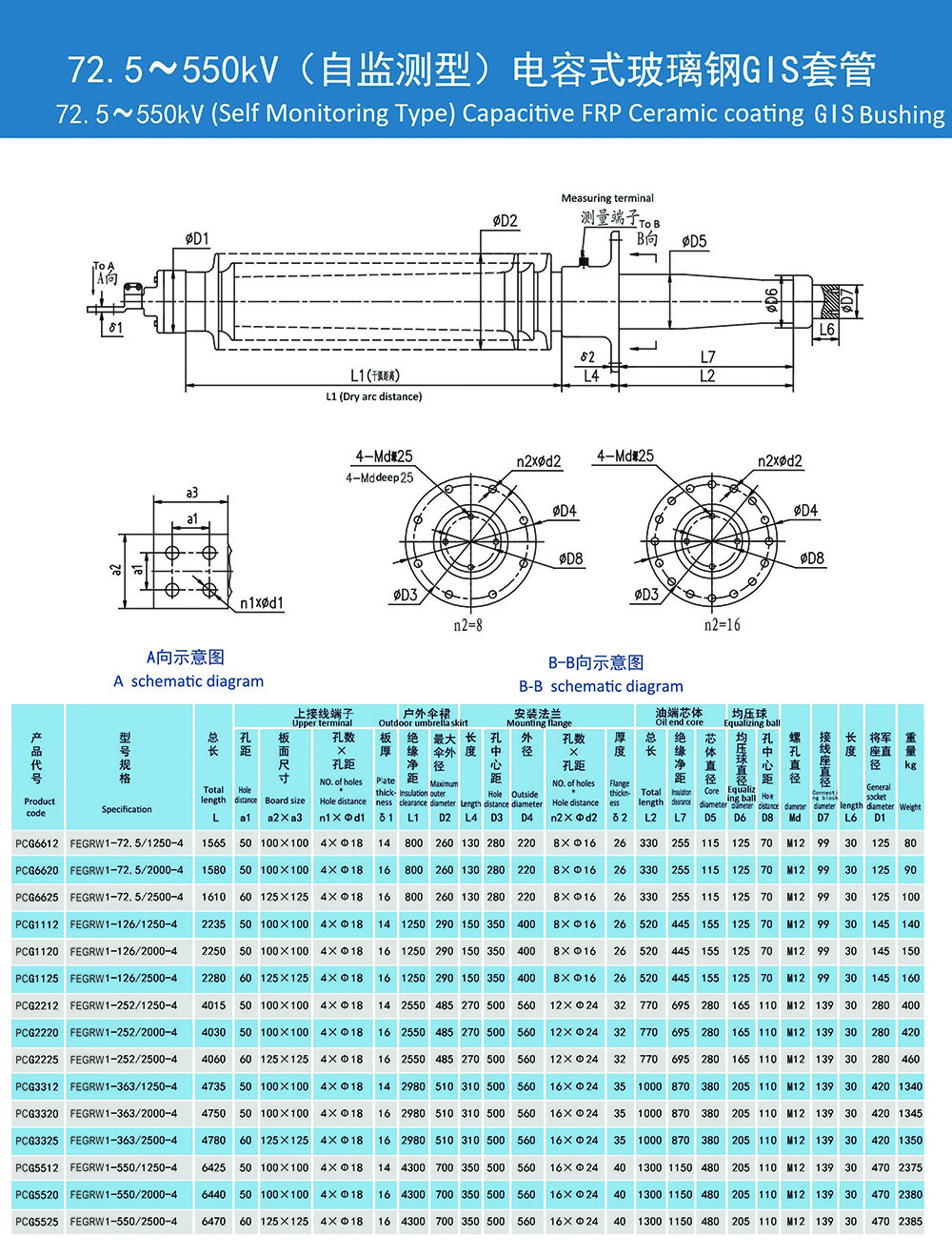 72.5~ 550kV (自監(jiān)測(cè)型)電容式玻璃鋼GIS套管