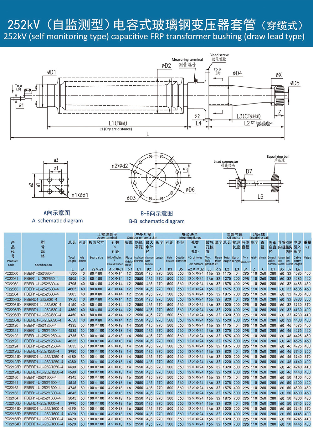 252kV(自監(jiān)測(cè)型)電容式玻璃鋼變壓器套管(穿纜式)