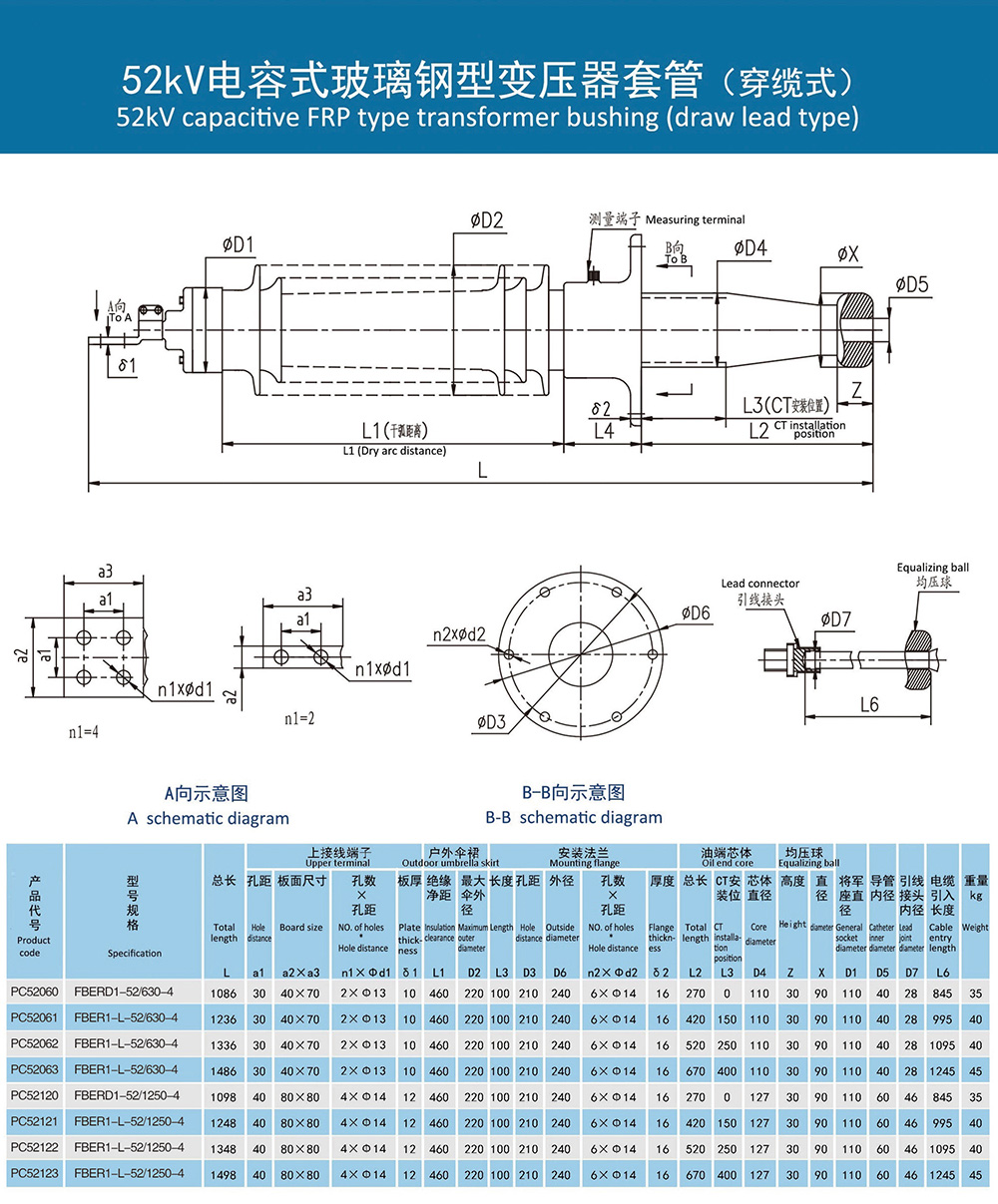 52kV電容式玻璃鋼型變壓器套管(穿纜式)